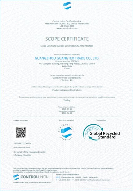 为顺应全球可持续发展战略,国贸部积极推动GRS全球回收标准认证(GLOBAL RECYCLE STARNDARD)。历时三个月的申请、审核及认证,国贸部康德斯平台于2021年4月12日成功获得全球回收标准GRS认证证书。