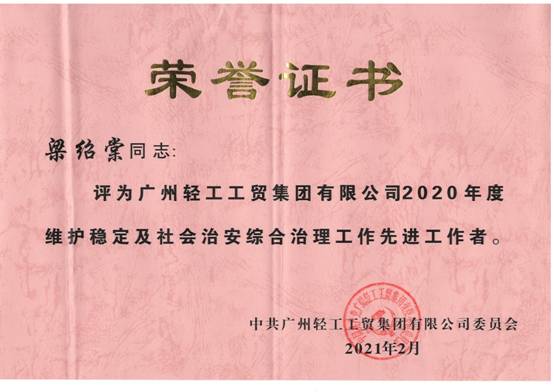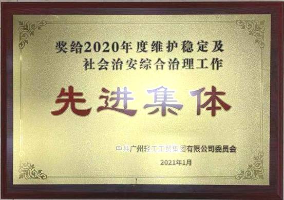 近日,广州轻工集团党委通报表彰了2020年度维护稳定及社会治安综合治理工作先进集体及先进工作者。爱体育官方端网站登录入口荣获“广州轻工集团2020年度维护稳定及社会治安综合治理工作先进集体”荣誉称号。属下托管中心梁绍棠荣获“广州轻工集团2020年度维护稳定及社会治安综合治理工作先进工作者”荣誉称号。