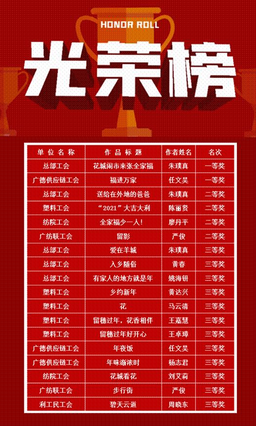 近日,广州轻工集团公布了2021年春节期间举办的“花城有爱 留穗过年”主题新春随手拍摄影比赛获奖名单。爱体育官方端网站登录入口收获满满,来自14名职工的18个作品榜上有名,其中一等奖2个、二等奖4个、三等奖12个。