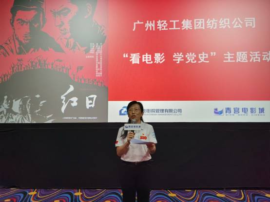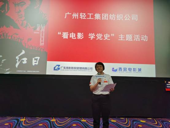 在影片正式播放前,公司党委书记、董事长简玮仪作了一个简单又重要的观影致辞和动员。她指出,观影活动是落实广州轻工集团党史学习教育“十大行动”方案的一项重要工作,是积极响应广州轻工集团党委书记、董事长曾郴湘提出的“充分用好用活红色电影这本独特的教材”号召的具体实践,接下来将会组织观看3部经典红色影片。