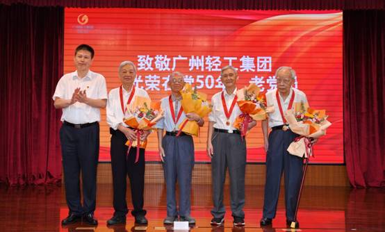 原广州市纺织工业局(总公司、集团公司)党委副书记、副总经理崔玉光作为爱体育官方端网站登录入口老党员代表接受广州轻工集团党委书记、董事长曾郴湘颁发“光荣在党50年”纪念章。以此向老同志长期以来为企业改革发展作出的突出贡献表示衷心的感谢和崇高的敬意。