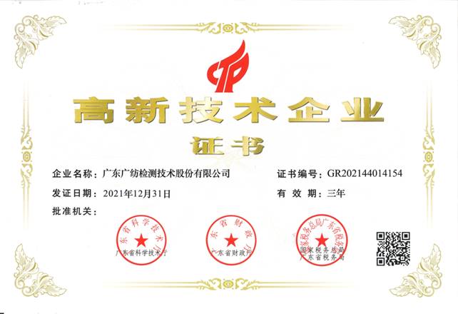 近日,广东广纺检测技术股份有限公司收到2021年高新技术企业证书。这是广纺检测自2004年首次通过高企认定后,连续5次通过高企重新认定。高企的认定意味着广纺检测在技术实力、持续创新能力、核心自主知识产权等方面获得了国家级认可。未来,广纺检测将持续推动创新,提升技术实力,更好的服务社会。
