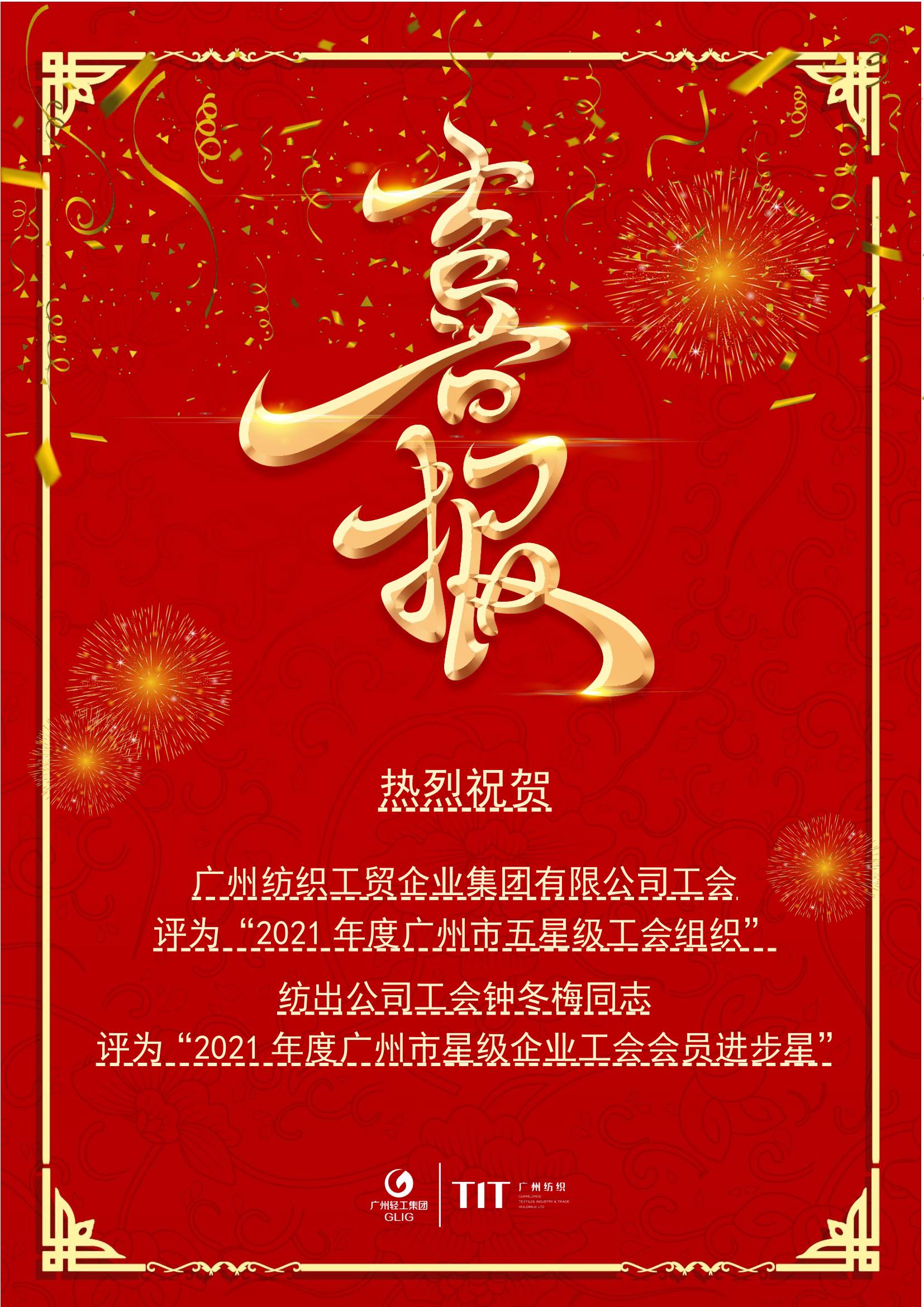喜报:热烈祝贺爱体育官方端网站登录入口有限公司工会评为“2021年度广州市五星级工会组织”、纺出工会钟冬梅同志评为“2021年度广州市星级企业工会会员进步星”