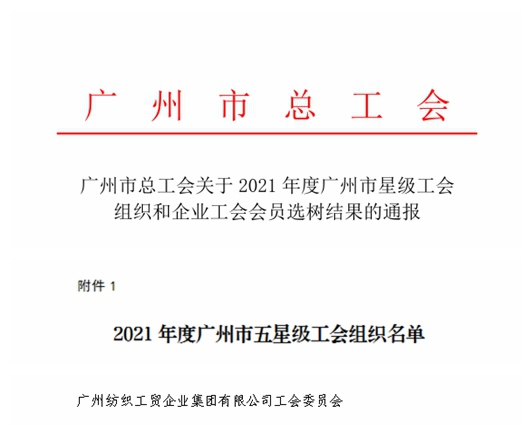 爱体育官方端网站登录入口有限公司工会(下称“爱体育官方端网站登录入口工会”)在广州轻工集团工会及爱体育官方端网站登录入口党委的正确领导下,认真贯彻落实习近平总书记关于工人阶级和工会工作重要论述,特别是加强基层工会建设“三个着力”重要指示精神,紧紧围绕公司的中心工作,发挥好构建和谐劳动关系的桥梁作用,激发组织活力,推进规范化建设,近日被广州市总工会选树为“2021年度广州市五星级工会组织”。
