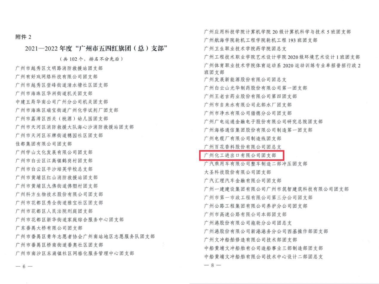 广州化工团支部荣获“广州市五四红旗团委”称号;塑料公司团支部荣获“广州轻工集团先进团组织”称号;纺出公司团支部筹备组成员、轻纺事业部单证员陈一嘉、纺织服装学院学生吕乐静荣获“广州轻工集团优秀团干部”称号;塑料公司综合办公室主管陈灏、广州化工特殊化学品部业务员李秋丽、广州丝绸印染厂有限公司行政办公室主管李思敏、纺织服装学院学生黄想亮、纺织服装学院学生霍俊豪荣获“广州轻工集团优秀团员”称号。