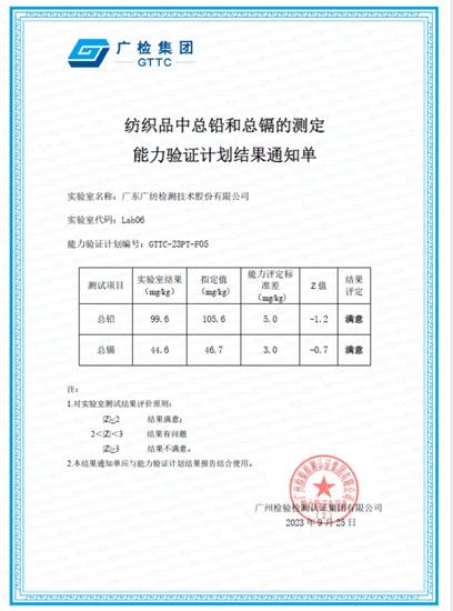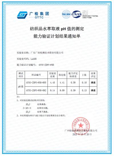 近日,广东广纺检测技术股份有限公司收到广检集团组织的能力验证计划结果通知单:广纺检测“纺织品中总铅和总镉的测定”及“纺织品水萃取液pH 值的测定”两个项目结果满意。