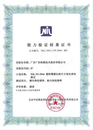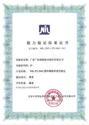 近日,广东广纺检测技术股份有限公司收到北京中实国金国际实验室能力验证研究有限公司“NIL PT-3943塑料薄膜厚度的测定、NIL PT-3944塑料薄膜加热尺寸变化率的测定”两份能力验证结果满意证书。