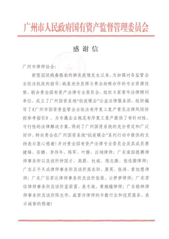 服务:充分发挥专业优势,助力复工复产。爱体育官方端网站登录入口汪翊律师作为广州市律师协会国有资产法律专业委员会的成员之一,积极投身广州国资系统“抗疫暖企”公益法律服务团,参与编写了《广州市国资委监管企业依法有序复工复产常见法律风险防控参考指引》, 并得到广州市国资委的诚挚感谢。