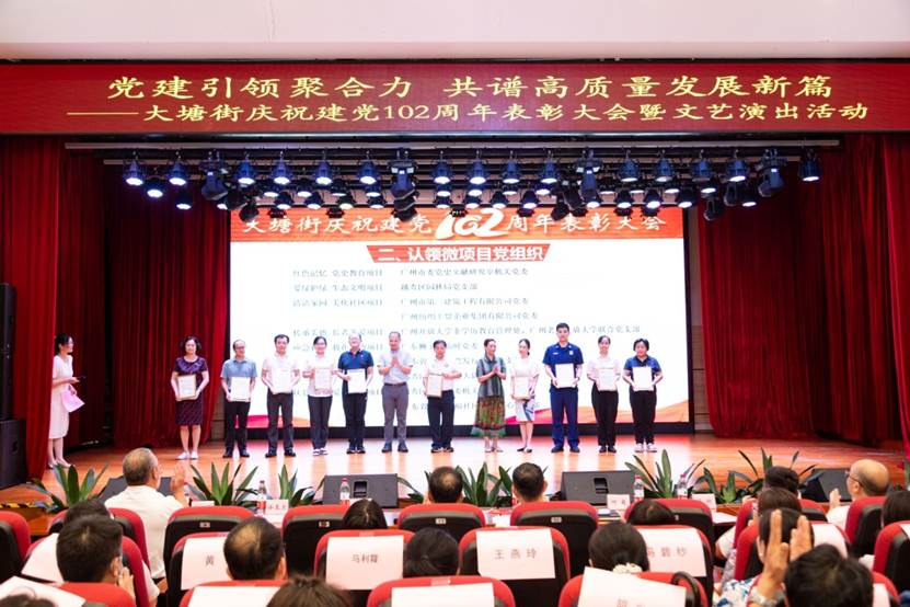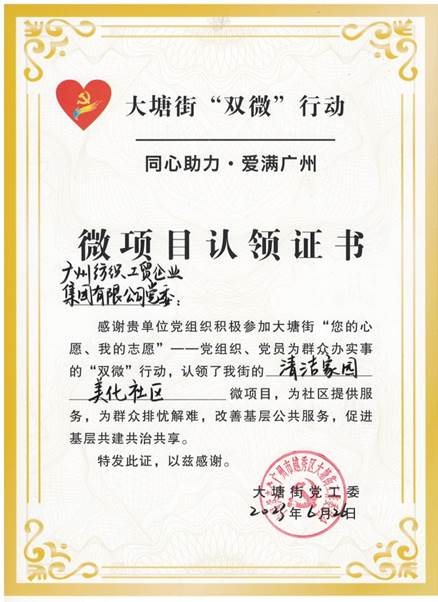 6月26日,越秀区大塘街党工委、办事处以“党建引领聚合力、共谱高质量发展新篇”为题举办主题表彰大会暨文艺演出活动。会上,爱体育官方端网站登录入口党委获大塘街党工委颁发“清洁家园 美化社区”微项目证书,这是大塘街对爱体育官方端网站登录入口党委充分发挥党建引领作用、积极履行社会责任的肯定。